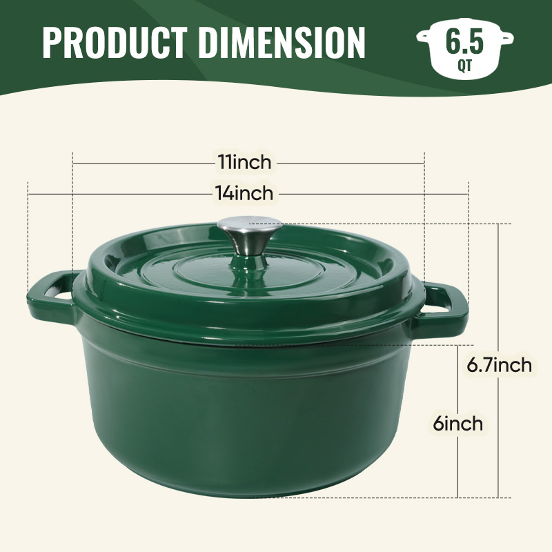 LARGE 6.5 QT CAPACITY:Our cast iron dutch oven can be used for multiple cooking methods such a cooking, baking, stewing etc.With this Large capacity enameled cast iron, can meet all the needs of family gatherings.The highest temperature tolerance is as high as 500°F.