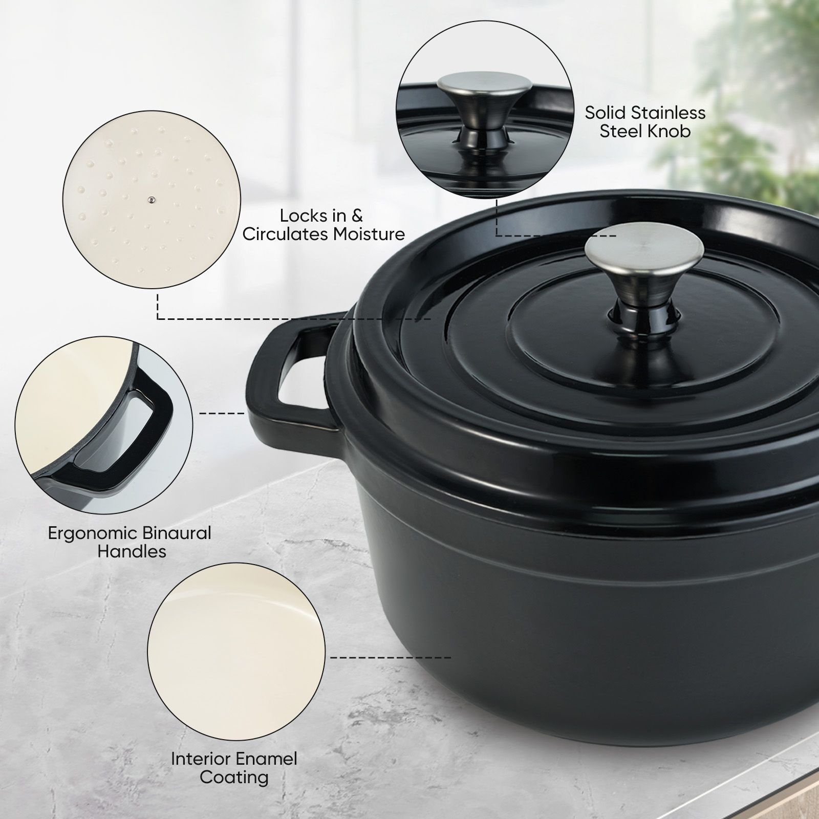 ��ENCLOSED THERMAL CIRCLE: This enameled dutch oven pot is design with circulating shower type lid, the raised design of the pot cover allows water vapor to circulate in the pot and locks the nutrition and moisture of the food, evenly fall on the food to maintain the original nutrition, possess pretty heat retention performance.