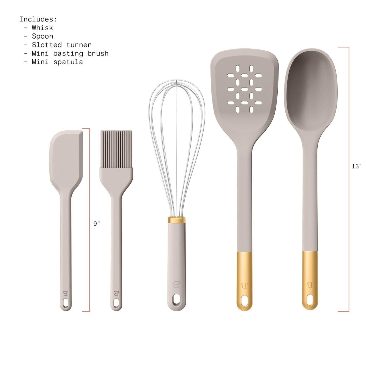 The perfect addition to your kitchen, our  5-Piece Kitchen Set has all the essentials. Featuring a slotted turner, spoon, mini spatula, whisk, and mini basting brush that are all chemical-free, and dishwasher safe.  Kitchenware combines elegant design, contemporary colors and modern silhouettes for high-performance appliances that look in your kitchen. Condition: new.