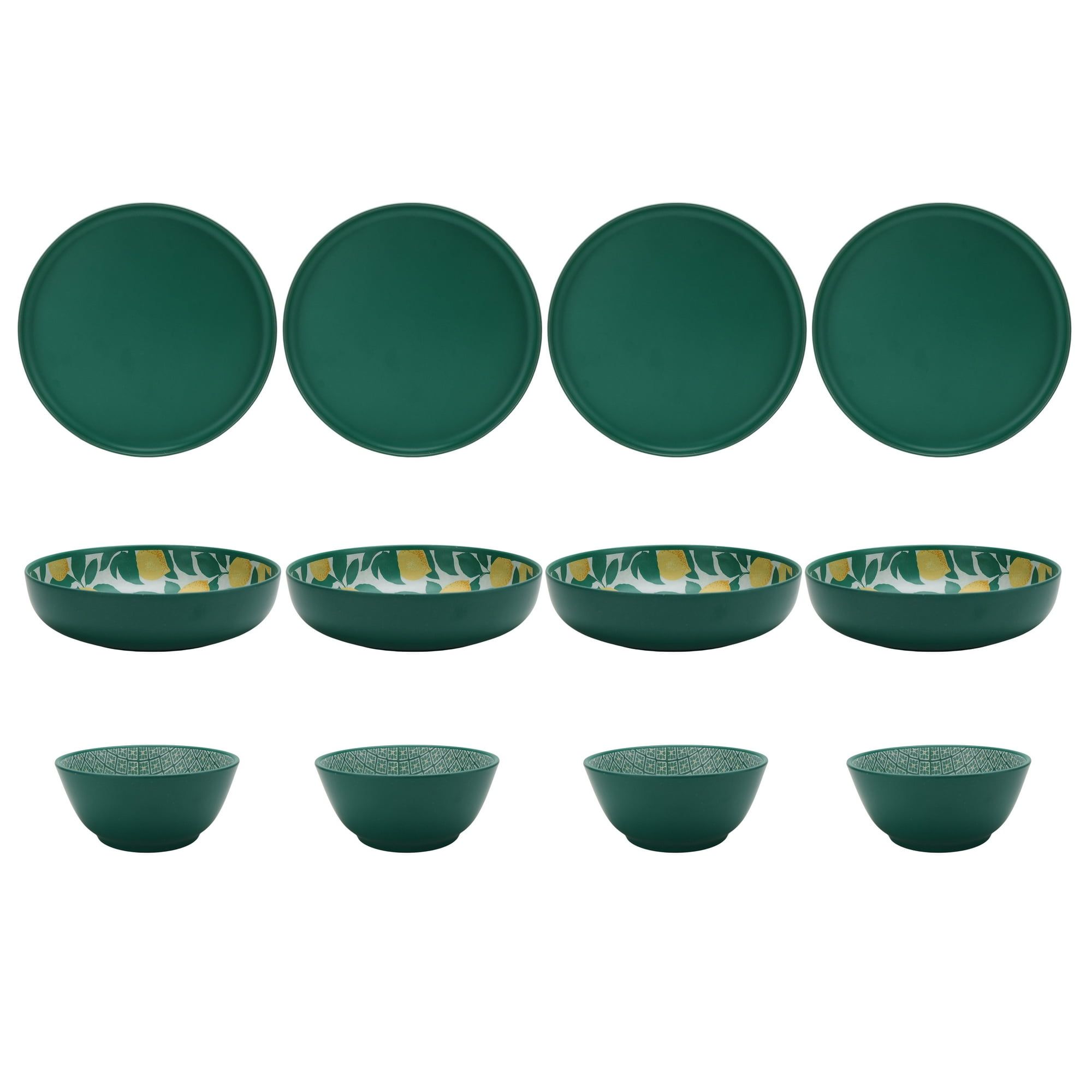 This 12-piece dinnerware set includes 4 dinner plates, 4 dinner bowls, and 4 cereal bowls, providing a versatile and complete solution for everyday meals and gatherings. Available in a range of additional colors and designs, it allows you to mix and match effortlessly, creating a coordinated and vibrant table setting that adds a pop of personality to any occasion. Crafted from BPA-free bamboo melamine, the set offers durability and lightweight convenience for daily use, though it is not suitable for microwave use. When cleanup time arrives, simply place the pieces in the dishwasher for easy, hassle-free maintenance.