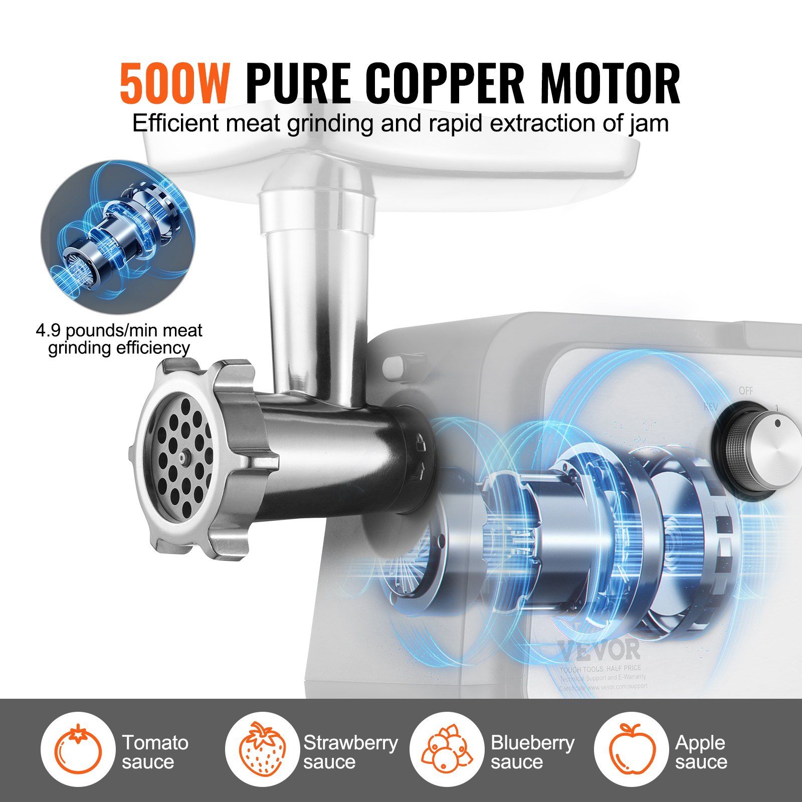 2.500W Pure Copper Motor: Using a pure copper motor, this electric tomato strainer provides surging power for extracting large amounts of jam quickly, 4.9lbs/min meat grinding efficiency without the need for waiting. The motor is protected by the body and has a built-in induction overheat protection system to ensure that it is secure even for long-term use. The main unit is made of ABS and stainless steel, which has good impact resistance, heat resistance and wear resistance for a longer use.