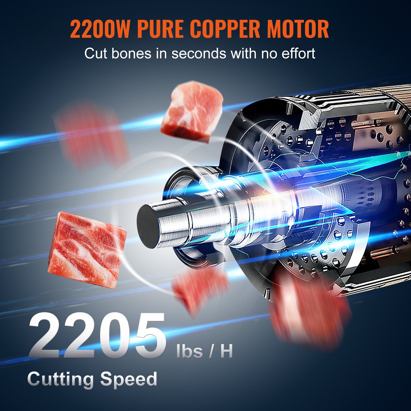 1.Stable & Efficient: The 2200W pure copper motor provides impressive power, and the sharp stainless steel saw blade, along with precision gears, ensures a cutting efficiency of up to 2205 lbs/H. Our electric bone cutting machine cuts smoothly without jamming, allowing you to easily cut various hard bones and frozen meat with a gentle push.