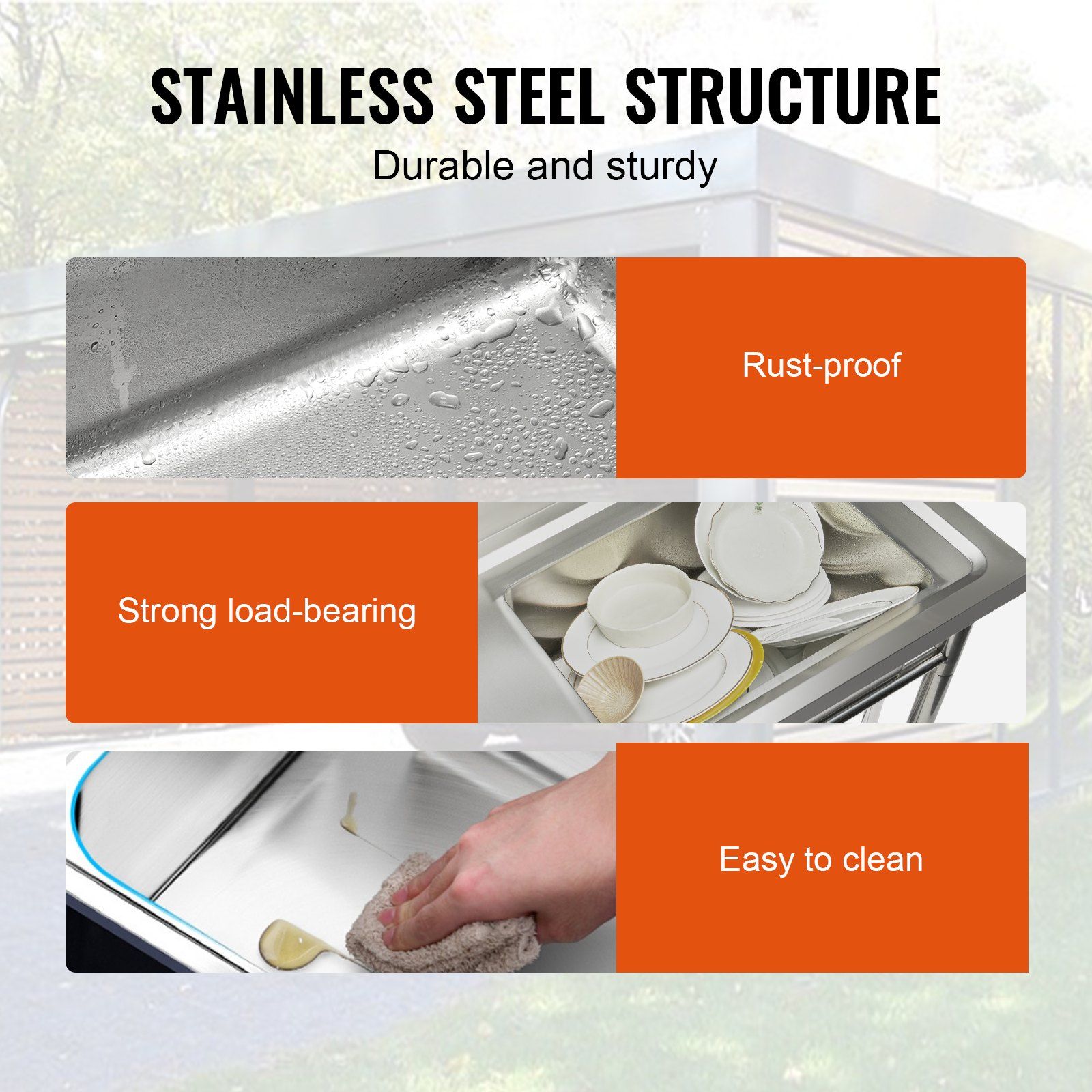 1.Stainless Steel Sink: Crafted with high-quality stainless steel for its excellent corrosion resistance, oxidation resistance, and durability. The all-metal construction ensures a longer lifespan in most environments. The adjustable legs ensure stability even on uneven surfaces.