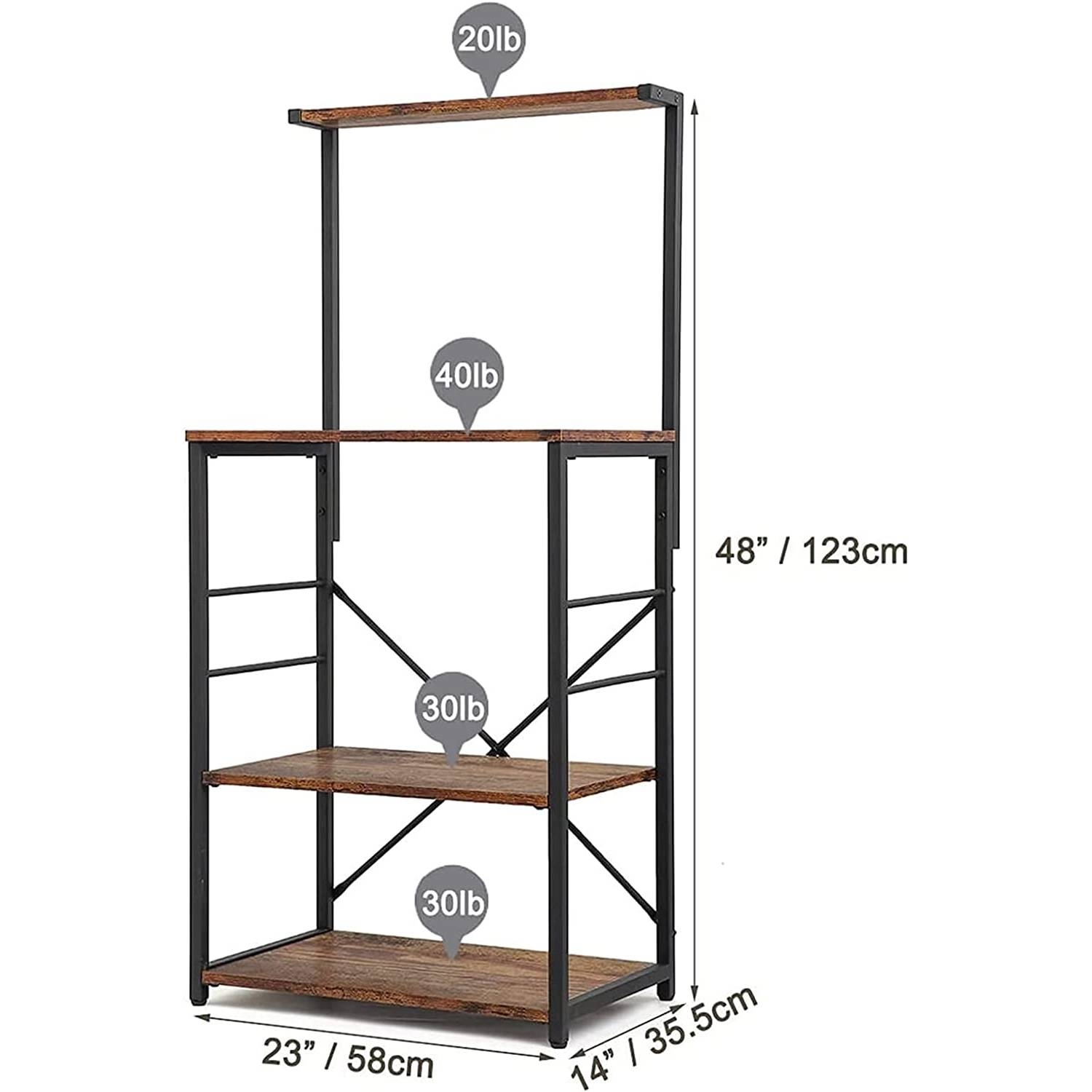 This Black Metal 4-Shelf Rustic Brown Wood Kitchen Baker's Rack Microwave Stand is high on utility. It is a perfect choice to be your microwave oven stand, kitchen baker’s rack, spice rack organizer, kitchen island, spice rack organizer, multipurpose workstation shelf, office storage rack, bookshelf and wine rack for your kitchen, living room, bathroom, bedroom, office and any occasions you need. X-shaped reinforcing bar provides more support for the shelf and ensures its strong stability and durability. High-quality and selected material makes every shelf has a strong bearing capacity. Each durable board prevents scratches, resist stains and dents. Meanwhile, the protective pads of the bottom can fully prevent your floor from being scratched. The idea of 4-Tier is completely designed for every home kitchen storage needs, which can offer larger space for your kitchen, you can place different items according to your needs, such as microwave, toaster, spice, plate, dishes, and any other things. The shelves of this baking rack are very easy to assemble and disassemble. It just takes you about 30 minutes to put it together pretty easily and then you can put it anywhere you need. A wet cloth is enough to clean the smooth water-proof shelf when it is dirty. The kitchen rack size is: 23" L x 14" W x 48" H, 4-Tier shelf can hold 120lbs. It's your best choice for storage and space saving.